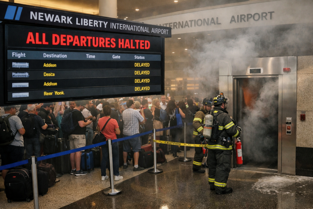 Travelers at Newark Liberty International Airport faced sudden disruption after smoke and a burning smell forced officials to evacuate the control tower and temporarily halt all departing flights. The issue was reportedly linked to an elevator, creating concern among airport staff and passengers.